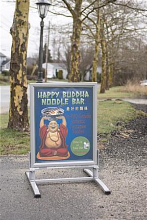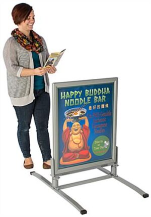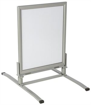 Using this spring loaded sidewalk sign will allow you to advertise outdoors without fear of weather damaging the posters it holds. The powder coated steel base has a springboard design that is sturdy but also allows for flexion when confronted with windy conditions. The double sided sidewalk sign includes a metal snap frame that is lined with magnetic strips to prevent your marketing materials from being damaged by the elements outdoors. Inserting and replacing your posters is easy thanks to the front-loading design, complete with anti-glare PVC lens for each side keeps your materials taut when utilizing the magnetic lining inside. The sidewalk sign’s attractive silver base will make your marketing material look great while also protecting it from unfavorable weather conditions. If you want to be able to advertise outside whether it’s raining or the sun is shining, this product was designed for you!