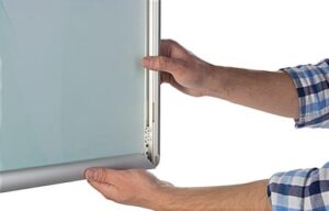 Ideal for promoting in a shop, trade show or lobby, this 22×28 snap open display stand attracts attention with an attractive silver finish and impressive height. The metal fixture is built for long-lasting heavy duty use with rust-resistant aluminum and a weighted steel base to ensure stability in busy venues. This poster display stand is easy to assemble and can be customized with the 4 channels in the pole. Simply slide in the included frame at an appropriate height to create the ideal design. Graphics are secured in place with the hinged metal rails that flip out to insert and close tightly to prevent artwork from sliding. As well, a non-glare lens is included to protect enclosed artwork from light glare and fingerprints. With a streamline design to conserve floor space, this fixture effectively promotes to customers while they shop without clogging aisles or pathways. Combining heavy duty metal with a modern look, this display stand works well in a variety of retail and business settings.