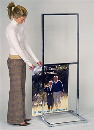 This economical chrome poster stand is imported to offer a low-cost option for our price point shoppers. This poster stand accommodates your 22″ wide x 28″ high posters back-to-back for double sided viewing. The poster stand is two-tier, so you can display up to (4) posters in this single unit. This poster stand loads from the sides; your posters simply slide in and out of the slotted frame without the use of any tools. We do recommend the use of heavier stock paper as this poster stand does not include clear acrylic poster covers or a middle poster support like offered on our own MFPH2CP unit (see related items on this page). With the lesser quality EMPS2CH unit, your poster is held in place only by the edges of the frame, which does not provide the same protection and support as our more upscale models. The viewable area is 20 1/2″ wide x 27″ high and the opening for poster insertion is 1/4″ wide. The chrome poster stand features levelers on the base so you can stabilize it on uneven surfaces. This two-tier design is very popular in retail environments. Put it in front of your store in the mall or to greet customers in your store.