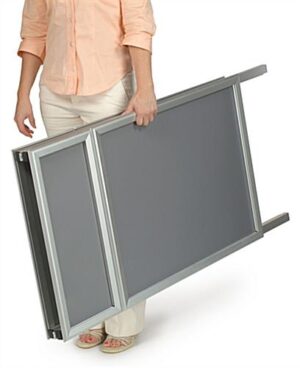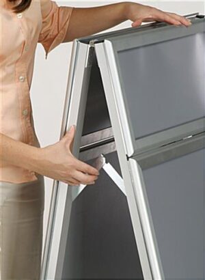 The A-board features an A-frame design, increasing your presentation’s overall stability. The pavement signage has feet that keep the unit standing tall. This outdoor sign holder, A-board is also equipped with snap-open poster frames, enabling you to update your graphics in minutes. Simply flip open the frames’ edges to insert graphics underneath the provided lenses. This A-board, such as sidewalk signs, can be used by various businesses to communicate current sales, menu items or future events. Such information is important to retail store, restaurant, and hotel customers. An A-board is portable, incredibly easy to set up and therefore a great addition to any marketing campaign!