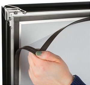 This outdoor sign stand is a sturdy and reliable option for a sidewalk poster display. The powder coated steel springboard base is anodized so it will not rust, making it a great fixture for advertising outside. Use the double-sided black sign stand to hold two 22” x 28” posters safely in place with a reliable snap frame construction. Interchanging your graphics is easy, allowing you to diversify your outside display whenever you’d like. The sign stand’s snap frame has a magnetic strip lining the interior, which holds a non-glare PVC lens in place to keep your graphics protected from inclement weather conditions such as wind and rain. Advertise outside without fear of weather damage to your marketing material by using this sturdy sidewalk poster holder.