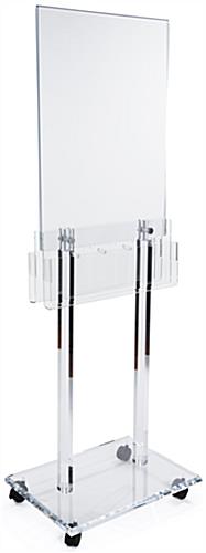 Display Stand- This poster display stands 67″ tall and holds two 22″w x 28″h posters for double-sided viewing. 5- pocket brochure holder attachment on both sides with adjustable dividers. The pocket rack can be configured anytime for standard 4″ wide brochures or 8 1/2″ wide literature. This acrylic sign stand moves freely on (4) locking casters. Easy assembly required, all hardware provided.