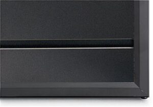 Slatwall Panel – Solid 23.5″ x 47.5″ slatwall panel with speckled black laminate finish, framed with satin black aluminum frame.