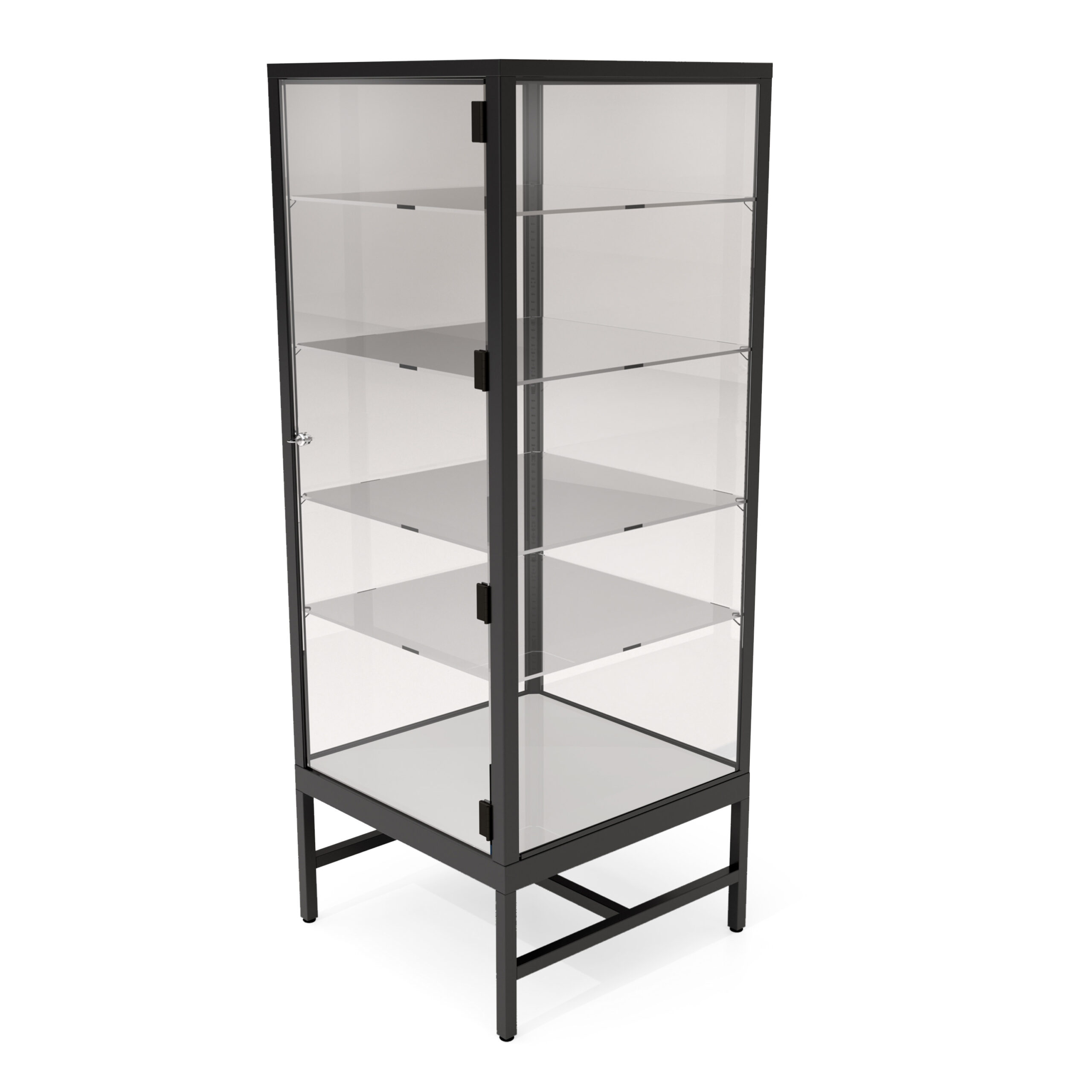Elevate your retail presentation with our premium glass showcase tower in three stylish finishes: Matte Black, Glossy White, and Satin Chrome. Designed for both durability and elegance, each unit features a sturdy steel frame, tempered glass panels, and acrylic accents. This case features four adjustable shelves with ½-inch height increments, allowing for flexible product placement. A cool white LED lighting strip ensures your items are beautifully illuminated. The locking door features a barrel lock for added security. With a generous 21.3″w x 21.3″d display area, for professional product presentation. This glass showcase tower is easy to assemble and break down, making it an excellent choice for dispensary retail use, trade shows, and pop-up retail environments.