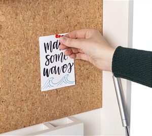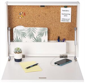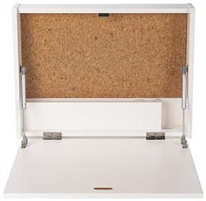 Our wall-mounted floating desk is the perfect space-saving workstation for your home office, studio apartment, medical exam room, or small business space. The folding laptop stand features cork board backing for easy pinning of calendars, photos, reminders, and more! This modern wall-mounted floating desk also has a built-in cord hole, allowing you to quickly charge your phone or computer without any cords or cables getting in your way when you work. The space-saving design has a small footprint, allowing you to maximize productivity in even the remotest areas while also providing you with practical storage for pens, papers, and files. This unit’s folding construction allows you to fold the desk part up and out of the way using the convenient magnetic catch. This laptop stand comes with two zinc-plated steel Z bars for easy mounting to most wall materials. Our compact wall-mounted floating desk will make it easy to turn any space in your house into a productive home office!