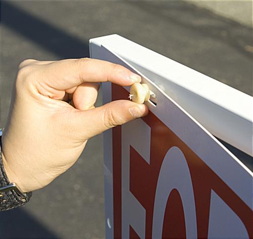 These display stands, real estate signs feature two different ways to hang your signs securely. We provide the real estate signs with two knobs to tighten the sign to the stand and 3 hooks from which you can hang your signs. We also supply the real estate signs with the required hardware for assembly. These realtor signs are shipped unassembled, but take less than 5 minutes to set up. Use these lawn signs to attract the attention of passersby!