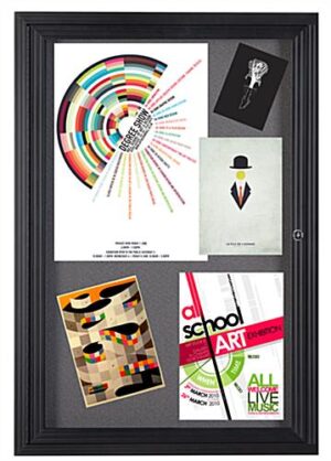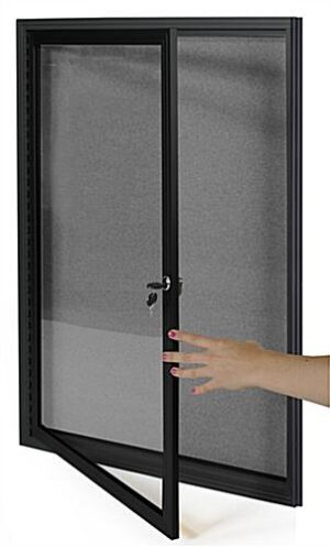 A fabric cork board, that has a black frame made of aluminum, is ideal for posting messages, artwork, posters, photos, and other announcements. Pin memos to this bulletin display in a home office or school classroom. Each fabric cork board, that has a gray interior, is surrounded by an aluminum frame. The black edge provides a sleek and stylish look to any environment. This fabric cork board, that is enclosed, has a self-healing backing. Pin messages and schedules repeatedly to the bulletin display. Each fabric cork board, that has a swingframe door, is designed with a single locking mechanism. Users will be able to keep craft material safe inside with the lock and key.