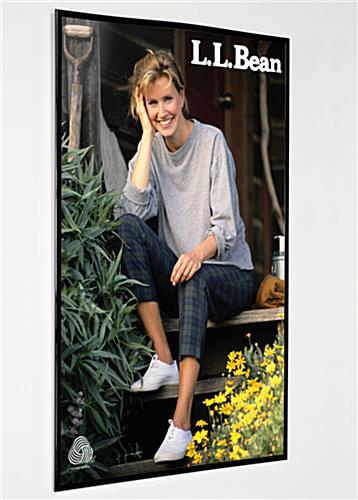 Your poster is held between a .125″ corrugated back support and a .030″ non-glare plastic lens. It is all held in place by black, Mylar accent molding. The molding slides onto each of the four sides of the cheap 24×36 poster frames, making changing your posters quick and easy.