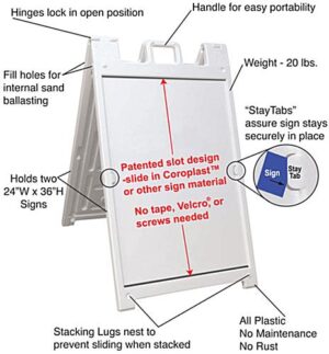 This advertising board called an outdoor display, sandwich board, or poster sign, is engineered for outdoor use! The hinges lock in position to prevent the sign from falling flat. The plastic construction featured on this advertising board will not rust or splinter. Advertisers can expect this model to last for a long time. The message board, advertising board may be filled with sand for added stability in inclement weather. At the top of the sandwich sign is a handle to make transporting the unit even easier. This advertising board is the premier outdoor display found online!