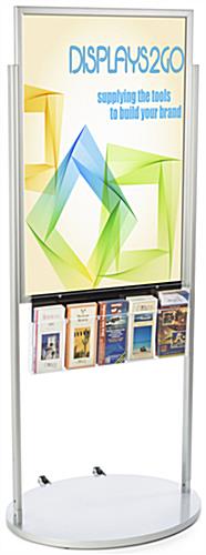This silver 24 x 36 moveable poster stand includes 5 literature pockets for pamphlets or magazines which can be used for endorsing your business. Each double-sided frame is complete with a powder coated texture and aluminum build for use in a commercial location. The 24 x 36 poster stand is a great way to feature your banner designs using the top loaded insert and protective non-glare lenses. The graphic display also features an acrylic magazine holder which can be sized accordingly to fit brochures, flyers, and booklets. Each poster stand features a double-sided design with a durable construction for use in heavily trafficked locations for years to come. The banner display is also intended to fit perfectly into the sturdy metal base which comes with 2 rear wheels for easy maneuvering.