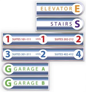 This modular wayfinding wall sign is a modern and stylish way to provide your visitors with the proper navigational signage to reach their destination. This custom printed acrylic signage can be mixed with the left and right directional pieces (BDWYFWMSN1L & BDWYFWMSN3R) to create an entire wall mounted display. Each personalized modular wayfinding wall sign includes invisible polycarbonate standoffs for a simple mounting solution. This design makes it easy to keep your custom printed acrylic directional tiles up to date as room assignments change, and your staff grows. This is a perfect directory solution for any shopping center, hospital, corporate office, airport, and much more. This modern modular wayfinding wall sign will minimize directional questions within your facilities, giving visitors a clear knowledge of where each store or office is located.