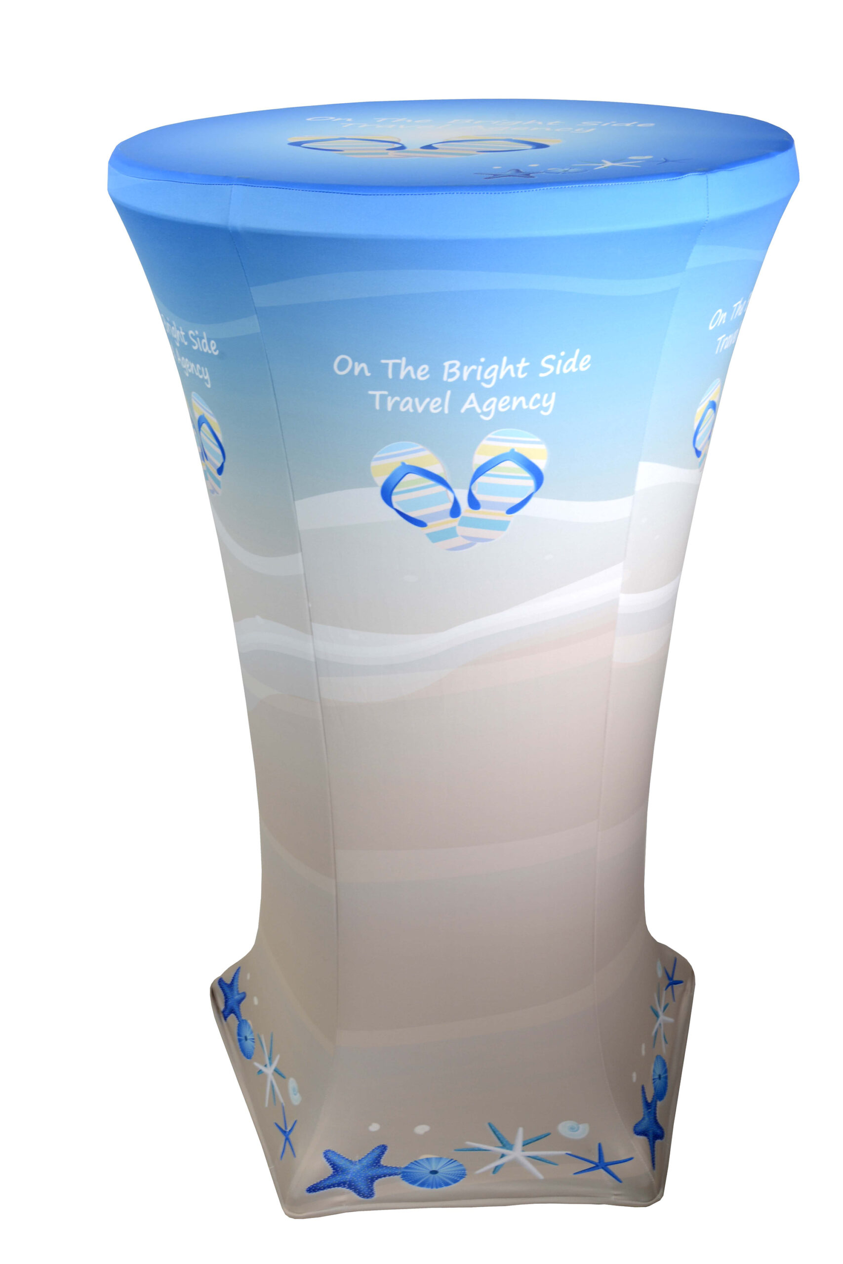 This custom cocktail table with cover is a great marketing accessory for events. Each promotional throw comes in a set with a 47″ high and 27.75″ round highboy. These bar style tabletops & cocktail table with covers are very eye-catching with the custom printing. This party throw is imprinted using dye sublimation. The printing method used on these cocktail table with covers allows customers to be as creative as they choose with the designs. Spandex linens are made to fully hide the bar style table. These cocktail table with covers that include a highboy are easy to use. The inside bottom of the linens feature (5) pockets. Each pocket of the cocktail table with covers fits a foot of the booth. The highboys that come with the party linens are collapsible for easy storage and travel. These cocktail table with full-color graphics are eye-catching even in high-traffic venues. Each spandex party linen is custom printed on all sides, including the top. These promotional throws are cocktail tables with affordable covers.