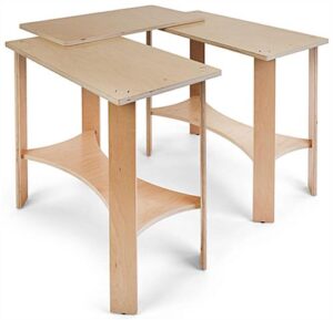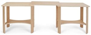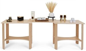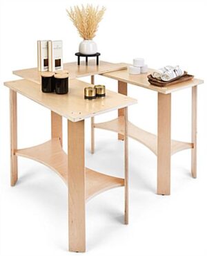 Our collapsible wooden display tables are a highly versatile and modern merchandising solution designed to showcase product in an endless number of configurations. Each 82″ long portable modular system features three individual floor-standing pieces that are hinged together to allow for a full range of movement. Constructed out of durable poplar wood with an eco-friendly natural laminate finish, these collapsible wooden display tables are lightweight enough to easily transport from one temporary exhibit to the next. Suitable for traveling events such as trade shows, craft fairs, and pop-up shops, this floor-standing fixture with knockdown design is easy to set up and break down when needed. This set of 3 collapsible wooden display tables each have a maximum weight capacity of 40 lbs with a 30″ wide by 16″ deep surface area, great for showcasing clothing, shoes, accessories, housewares, and much more. Our portable modular system will help your business create a modern showstopping exhibit that will be sure to turn the heads of passersby!