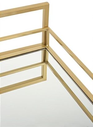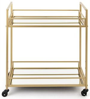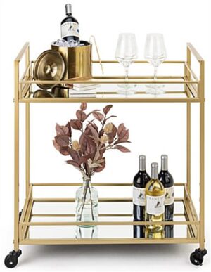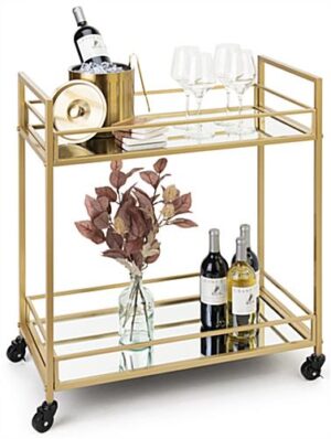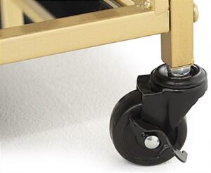 Our two-tiered french trolley bar cart with wheels is the perfect portable solution for housing your wines, spirits, and more. Beautifully crafted of gold-toned iron and mirrored glass shelving, this rolling beverage display features an art deco inspired design that adds contemporary appeal to any space. Each 28″ x 31″ french bar cart includes two locking and two non-locking caster wheels with 360° swivel rotation enabling limitless mobility. Suitable for restaurants, cafes, or even the home, this portable display has a durable powder-coated frame that withstands scratches, chipping, and fading when placed in high-traffic areas. Additionally, this two-tiered trolley bar cart is surrounded with tall safety rails to prevent items on each mirrored shelf from falling. Provide plenty of space for your go-to drinks and gadgets for entertaining and make sure guests are always taken care of with this art deco beverage display.