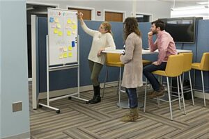 Brainstorm ideas or set up your own custom project board on this dry erase whiteboard. The writing surface is made from painted steel, which helps to prevent ghosting over long periods of use. This portrait-oriented whiteboard is also built to maximize available space, with locking wheels that allow it to be moved out of the way easily when it’s time for your daily stand up meeting. The flippable body allows this dual-surface mobile project board to double as a brainstorming tool with a whole second side to house your ideas. A painted steel body and aluminum frame keep the whiteboard light, making it easy to move from place to place. The easy lock mechanism allows the surface to be flipped and snapped into place without any hassle. Get your team acquainted with Agile project planning with a custom task board today!