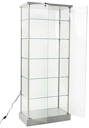 This glass showcase is a timeless and simplistic front opening display case. Elegantly store and arrange retail merchandise upon the (5) height adjustable shelves to make a contemporary composition. Art, jewelry, collectibles, and high ticket items are all neatly framed by the aluminum extrusions of this locking showcase. Concealed beneath the silver veneer base are (4) swivel casters, making this display case easily movable when rearranging a floor plan. Additionally, the (2) recessed LED lighting fixtures located in the canopy top allow retail products to be highlighted throughout entire full vision cabinets. Soft, yet effective lighting provides an eye catching merchandising presentation. Trophy store fixtures with (2) locking hinged doors allow employees to easily access items when stocking products or making a sale. An Illuminated and aluminum framed showcase provides functionality, as well as sophistication to any specialty shop, studio, or showroom.