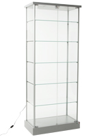 This glass showcase is a timeless and simplistic front opening display case. Elegantly store and arrange retail merchandise upon the (5) height adjustable shelves to make a contemporary composition. Art, jewelry, collectibles, and high ticket items are all neatly framed by the aluminum extrusions of this locking showcase. Concealed beneath the silver veneer base are (4) swivel casters, making this display case easily movable when rearranging a floor plan. Additionally, the (2) recessed LED lighting fixtures located in the canopy top allow retail products to be highlighted throughout entire full vision cabinets. Soft, yet effective lighting provides an eye catching merchandising presentation. Trophy store fixtures with (2) locking hinged doors allow employees to easily access items when stocking products or making a sale. An Illuminated and aluminum framed showcase provides functionality, as well as sophistication to any specialty shop, studio, or showroom.