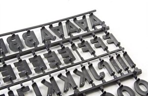 menu display. The black characters are easiest to view when used on top of a white background. These sign letters, also known as replacement menu board inserts, include tabs to easily insert your characters into letterboard channels. The changeable numerals include 6 sheets of numbers, symbols and all of the ABCs. The set includes 900 characters! These sign letters can be used on a variety of menu boards and message displays. The tabbed characters kit has more vowels and primary consonants. (Please view the PDF document linked below for actual counts.) These sign letters are made from injection molded plastic.