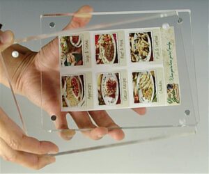 These magnetic photo holders are made from two 3/8″ acrylic blocks and feature a clear double sided view. 4 super strong magnetic pegs help to hold photos tightly in between the two panels. These magnetic photo holders, also known as polished heavyweight magnet frames have a professional finish, can be used in either landscape or portrait orientation.