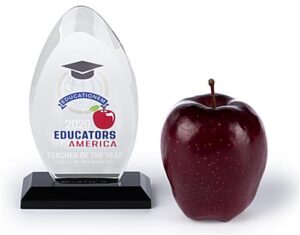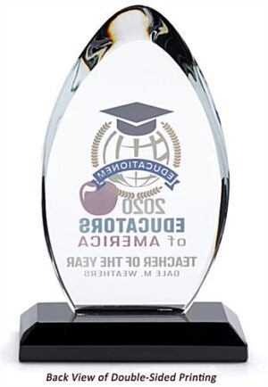 Our custom glass recognition awards are now available with full-color 2-sided printing. This trophy is ideal for corporate branding events, educational accomplishments, or special celebrations. This teardrop-shaped custom glass recognition award has a width of 3.75”, a height of 5.75”, and comes with a black base. There is no better way to show appreciation for employee service or a job well done, than with this 2-sided personalized printed trophy. Having the ability to print on both sides creates a 3D effect that is sure to impress that honored recipient. Whether you are using this glass recognition award with a base for a corporate event or showing gratitude for volunteer service, make your honorees feel as special as they deserve.