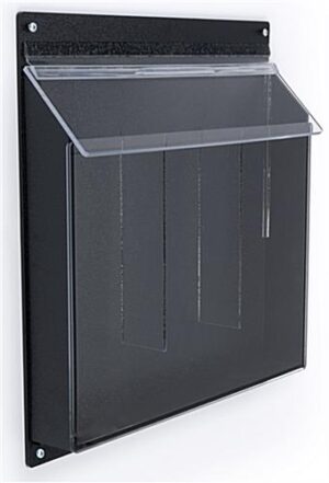 These outdoor brochure holders are perfect for holding 4″ wide brochures or standard sized bank deposit envelopes. The outdoor brochure holder’s hinged cover snaps shut to keep elements away. The brochure pockets are 2″ deep. Dimensions of these outdoor literature holders are 15″ wide by 16″ high. Constructed of durable black textured .125″ ABS plastic backboard with strong, high-impact .125″ clear plastic pockets & lid.
