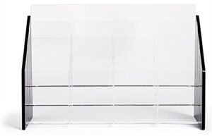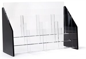 This leaflet holder is ideal for cramped or crowded locations. This fixture holds up to twelve different brochures or pamphlets in one compact unit. Does your company need a leaflet holder to offer various flyers to customers? Do you want a brochure rack with a unique yet effective design? This leaflet holder, also known as a pamphlet stand or leaflet display, is recommended for use in offices, lobbies, community centers, or retail locations. It holds up to 18″ (total), of standard-sized brochures. This flyer rack is a sleek and stylish leaflet holder, sure to complement any décor. The clear front panel and black acrylic sides make for a neutral fixture that blends with any style or theme.