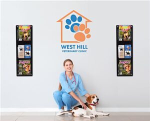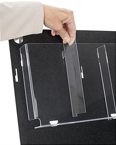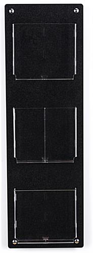 This wall mounting magazine and brochure holder features a contemporary black 3 tiered design with optional clear acrylic pocket dividers to display various literature at government agencies, banks, schools, libraries, retail stores, and more. The modern catalog rack ships fully assembled with pre-drilled holes for a quick and easy installation. Our black wall mounting magazine and brochure holder is made of durable acrylic with 4 stainless steel standoffs, adding a sleek touch to your office. This USA-made design will keep your literature organized and wrinkle-free, providing patrons with reading material. Use the optional clear pocket dividers included with our acrylic display to switch out pamphlets for catalogs when desired. This 3 tiered wall mounting magazine and brochure holder is perfect for providing takeaway pamphlets for local attractions, shopping centers, local banks, real estate agencies, and more.