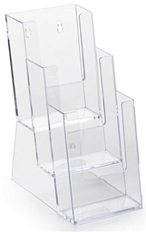 Molded Plastic Three Tiered Brochure Racks- These pamphlet racks are fabricated from injection molded plastic and should be purchased for economic price budgets only, This series of racks are not as upscale as our other “true acrylic” hand fabricated brochure racks. Some of these brochure racks have a slight blue tint; manufactured runs are not always 100% optically clear plastic.