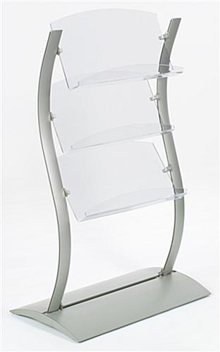 The brochure stand features (2) curved side supports, constructed from brushed aluminum and finished with a smooth silver. This aluminum display, brochure stand will resist rust when used indoors. This promotional fixture is also a modifiable brochure stand. To change the height of each holder, simply slide each bracket along the channels of each side support. We even provide the brochure stand with moveable connectors, allowing a user to alter the angle of each pocket. Also, included with your unit is a 5-pocket literature divider for optional use. This brochure stand, such as our other wave displays, will help generate a greater interest in your pamphlets.