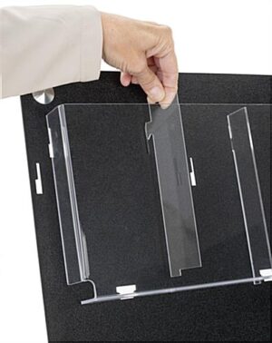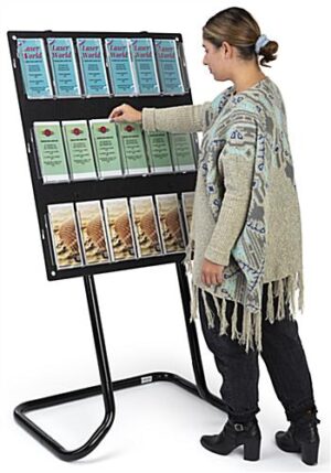 This tiered acrylic literature floor stand is constructed of black metal for durability and includes clear pocket dividers to hold pamphlets and magazines. Our modern display is highly portable and lightweight, making it convenient to assemble at trade shows, travel facilities, health clinics, and more. This black tiered acrylic literature floor stand is perfect for advertising new products, promos, and sales on pamphlets or catalogs in your business. Our exclusive brochure holder is made in the USA and comes with all the necessary hardware, for an effortless assembly that takes only minutes. You can easily switch out your marketing content from the rack by snapping the clear pocket dividers into the precut slots. Each display comes with 1.5″ inserts, perfect for ensuring that your reading material will stay secure. This contemporary tiered acrylic literature floor stand is ideal for keeping your advertising organized and up to date in supermarket entryways, retail shopping centers, gas stations, and more.