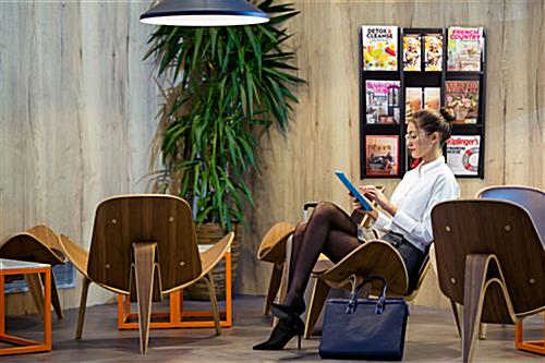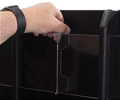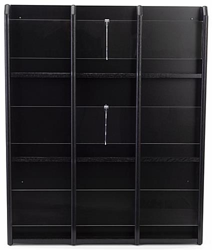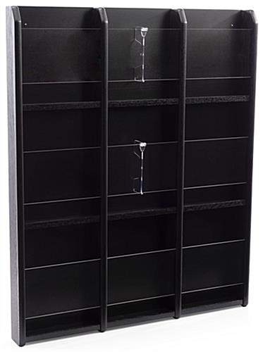 This black finish magazine rack offers a wall-mounted solution to keep reading materials organized and accessible for people to use in waiting rooms, banks, libraries and more. The literature holder is made of durable solid oak wood, ensuring a long-lasting design. This tiered wall-mounted black finish magazine rack ships completely assembled, ready to use, and it comes with 9 optional clear acrylic dividers. The inserts allow you to switch out catalogs for folded brochures when desired and provide an unobstructed view of the literature. Our optional 4″ x 9″ clear acrylic dividers will keep pamphlets from falling out and wrinkling, making it great for your office. This tiered black finish magazine rack adds a stylish yet professional look that will look great in any law firm, healthcare facility, real estate agencies, and more.