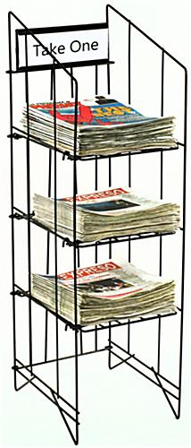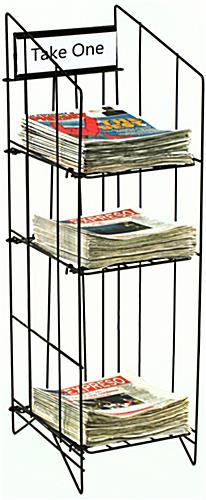These affordable newspaper racks are made to store tabloid size newspapers. These newspaper racks are fabricated with a durable gloss black powder coated finish. There are 3 shelves on these newspaper racks allowing you to place 3 different types or brands of newspapers in one rack. These newspaper racks are appropriate for use in grocery stores, supermarkets, or any retail environment.