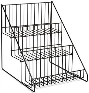 Use this 3 tier wire countertop rack to display all kinds of merchandise in convenience stores, pharmacies, and other retail locations. Each multi-purpose fixture has a stylish jet black finish and steel assembly that blend in perfectly with any environment. Customers will be able to quickly locate any item held within the black countertop rack due to an ergonomically angled design. The multi-purpose fixture can accommodate merchandise up to 12” wide! Increase last minute sales by strategically placing the countertop rack near registers. Conveniently display items of choice in an organized and tidy manner at your store with this stand!