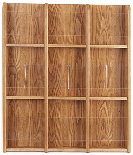 This wall hanging 9 magazine display is a solid wood fixture with a medium oak finish made for organizing waiting room reading materials. Manufactured by Wooden Mallet™, the literature rack is built to last a lifetime and look good doing it. Our wall hanging 9 magazine display boasts full-size pockets with clear acrylic stops, offering an unobstructed view of the periodicals. As an added feature, optional pocket dividers create two slots for adding folded brochures if desired. Mount this wall hanging 9 magazine display in any interior waiting room, office, or public area to encourage a better organizational and clutter-free environment.