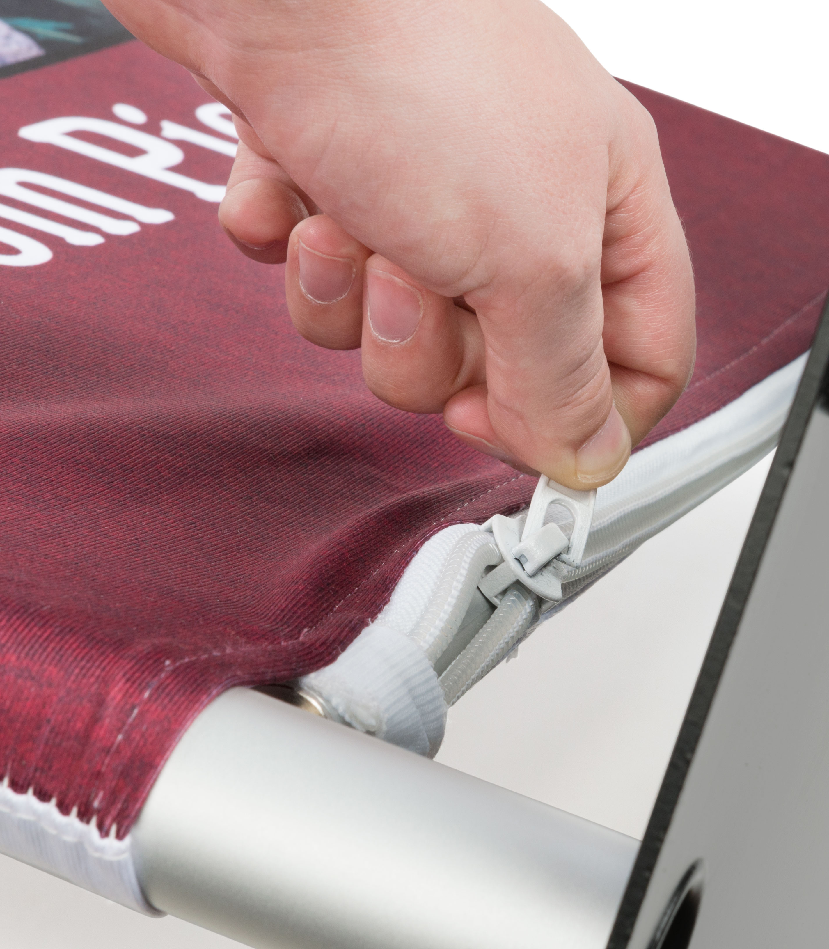Using vibrant dye sublimation for high-quality graphics, this double sided fabric banner stand is an excellent upgrade to any trade show booth or event promotion. The 7.5’ tall backdrop uses its commanding height to grab attention while the weighted steel base helps keep the fixture steady. Each premium banner stand offers 2 printing areas, allowing for each area to feature custom artwork for twice the promotion. Simply slip the graphics over the aluminum frame and zip under the bottom pole to create a taut and impressive display that will be sure to capture a passing visitor’s attention even at a busy trade show. A pair of cotton gloves is included with the unit to help prevent marks on the aluminum poles and dye sublimation textile. To simplify both assembly and breakdown, the exhibition display uses a push-button design to easily connect and separate the poles. Carrying bags are included for the frame, base, and custom graphic to ensure that the banner stand remains organized and is protected when transportation to the next venue.
