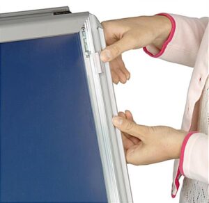 This A-frame sign is a sandwich board that can hold two 30″x40″ posters or signs. Allow a 1″ perimeter around the entire poster for the frame edges. The A-frame sign sits on 4 legs about 6 inches long. Perfect for setting outside your office walkway or retail front entrance, the A-frame sign is made from aluminum and designed for outdoor use. The A-frame is an outdoor sign that contains a protective lens made from PVC plastic that will reduce the chances of water from seeping onto your poster. The lens covering is made from a non-glare plastic so the sign remains clearly visible even in the bright sun. Also, the A-frame sign has a viewable area that is large enough to be seen from a distance.