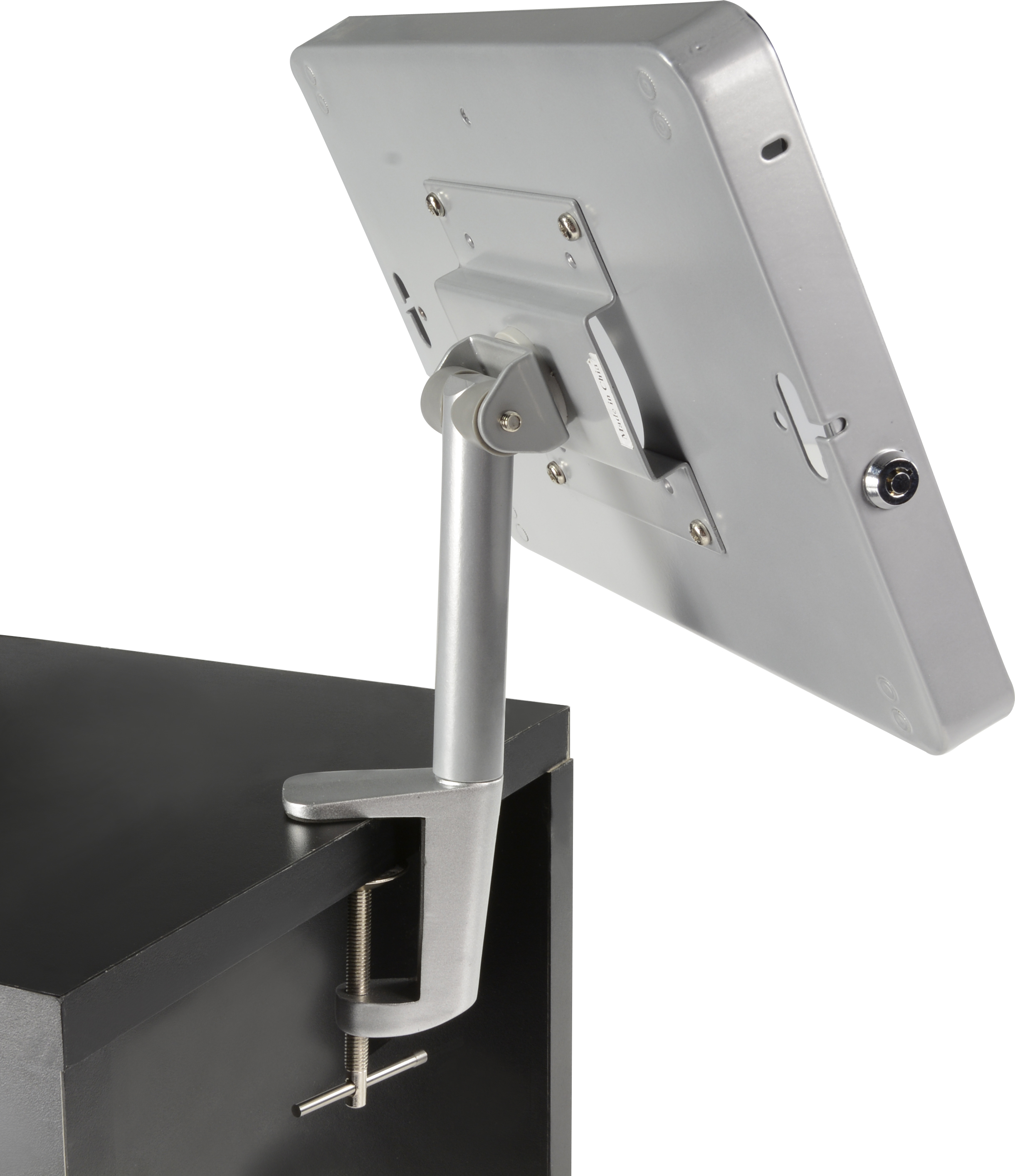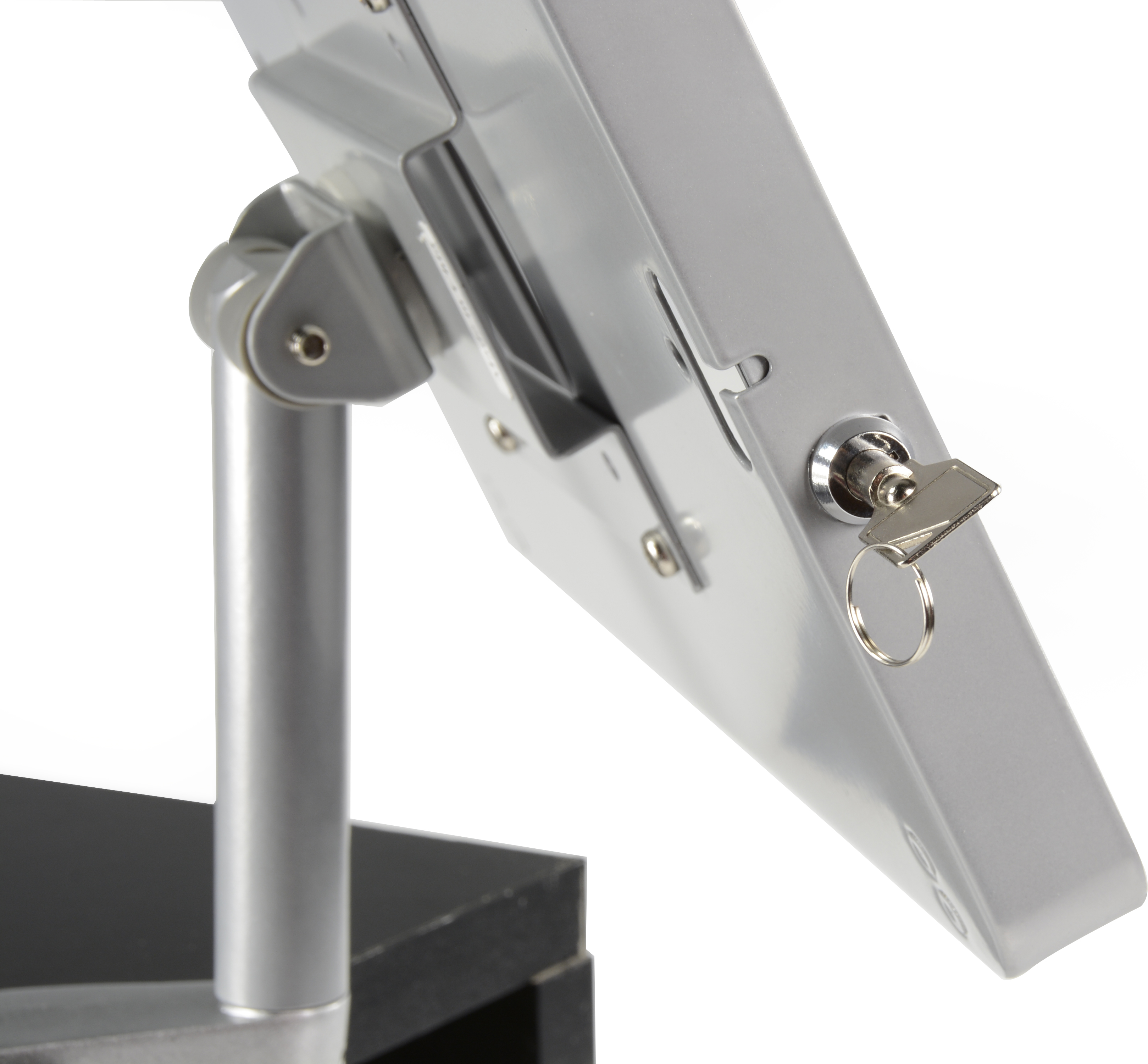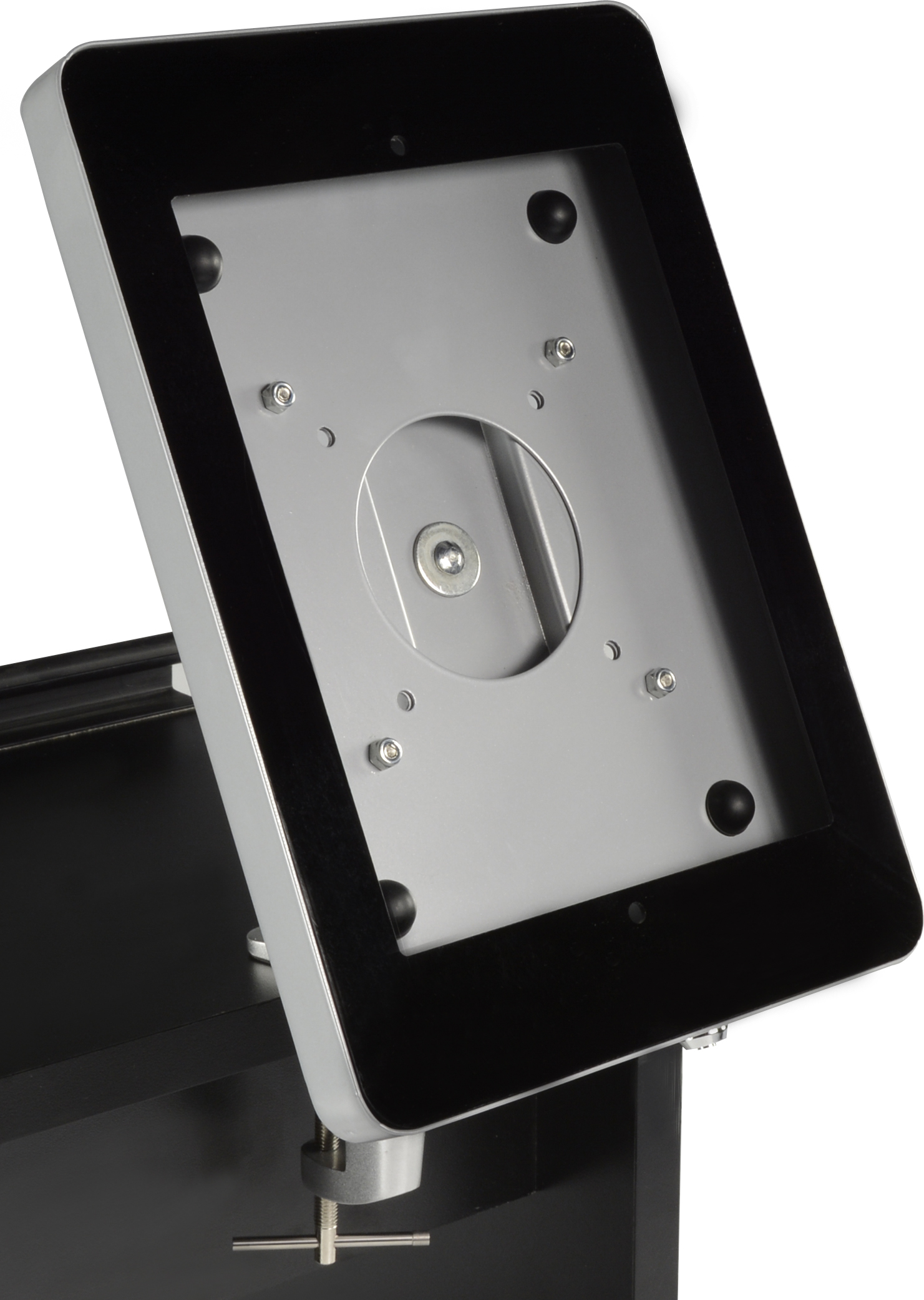 The promotional counter with iPad mount is a portable design for trade show booths. A 31” wide and 78” tall table constructed of cream white corrugated plastic supports a rectangular header that displays posters of company names and products. Inside the trade show counter with iPad mount are (2) shelves for storing extra samples and literatures. A silver steel-made clamping Apple® tablet holder with a locking enclosure and a hidden home button is included with this kiosk that complements the white display stand and catches the attention of customers. The counter with iPad mount tilts and rotates for optimal viewing and is a great way to advertise company products and ideas with a kiosk that easily fits in any booth size and uses Apple® device software. The portable unit assembles quickly and disassembles into a carrying bag for easy transport to different exhibitions, meetings, and other events!