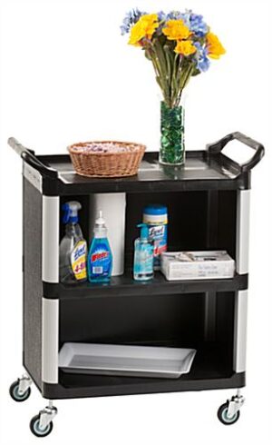 Improving the functionality and efficiency of businesses, this three shelf utility cart is an ideal tool for schools, hotels, restaurants, medical practices, warehouses, store sales floors, and office buildings. The triple black plastic shelves provide an area to hold a large capacity of equipment and supplies. This three shelf utility cart, also known as a service trolley, is enclosed on three sides. The walled shelves ensure products will remain securely in place when transporting. The three shelf utility cart with aluminum uprights provides durability. These mobile pushcarts are a lightweight tool to transport various products without difficulty. Each enclosed three shelf utility cart conceals unsightly messes when functioning as a bus trolley.