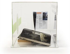 This custom printed collapsible display pedestal box is an effortlessly portable case that draws customers and trade show attendees toward your merchandise through vibrant branded messaging. Realize your unique vision by showcasing logos, taglines, or supporting imagery alongside your displayed items. Full color graphics can be applied to all six sides of this clear acrylic printed collapsible display pedestal box, allowing for some truly inspired designs to come to life. Easily build and break down without using any hardware or tools, thanks to the slide-and-lock assembly style. The flat-stacking acrylic panels make this 33″ wide case exceptionally portable and simple to ship – a must have for trade show season. This printed display pedestal box helps create an eye-catching showcase for any advertising or marketing effort.