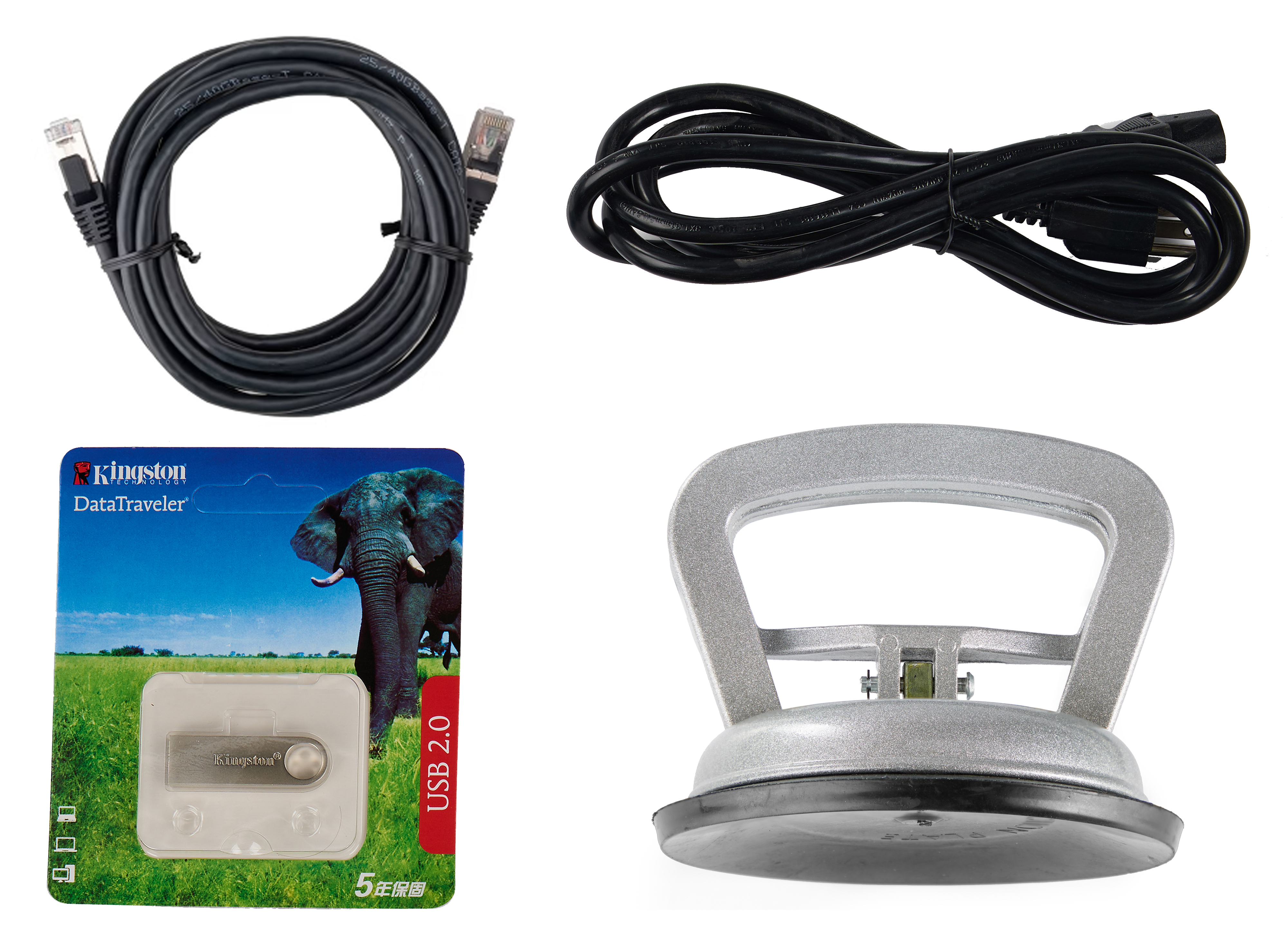 Includes:Power Cable, USB Stick, Suction Cup Tool, Ethernet Cable