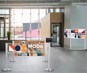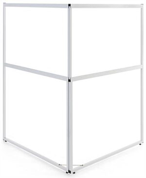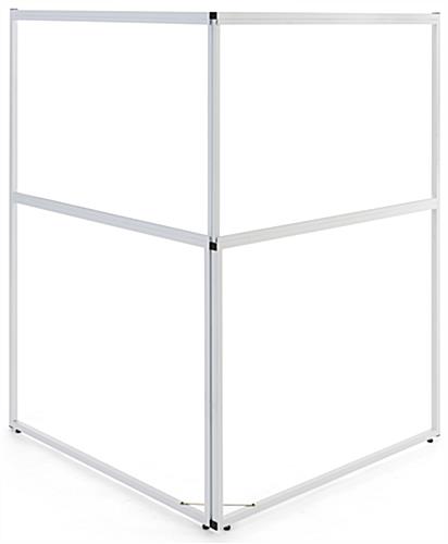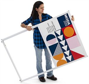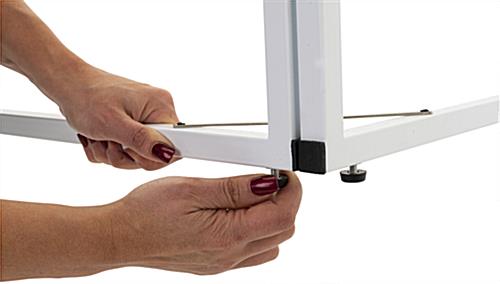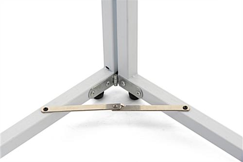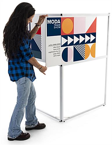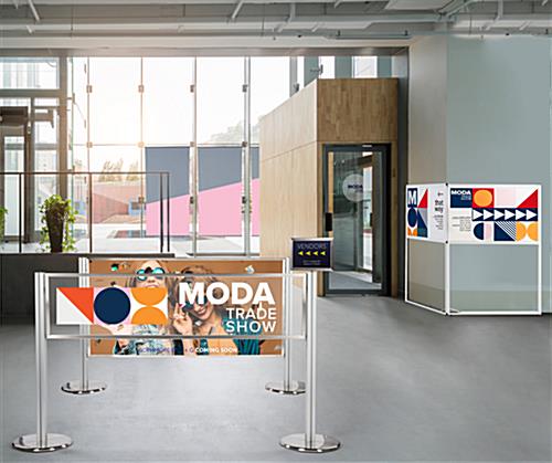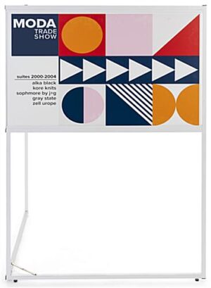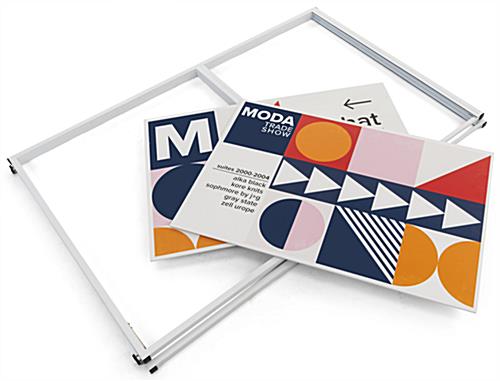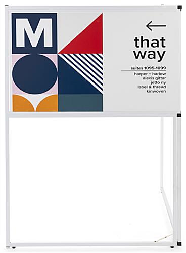 This personalized floor standing corner signage offers hotels, trade shows, corporate offices, universities, and retail businesses a wayfinding solution ideal for identifying designated locations in high traffic areas. Designed for durability, this multi-direction sign has a collapsible frame made of durable white powder-coated metal and includes four adjustable floor levelers that provide extra stability. Each standing corner signage includes two custom single-sided panels that conveniently slide into this unit’s frame perfect for quick graphic updates. The 36 x 24 UV printed panes wraparound this wayfinding fixture to maximize the visibility of your personalized pathfinding design for guests coming from both directions. Additionally, this standing corner signage with hinged closure is easy to assemble, disassemble, and transport due to its lightweight construction and tool-free assembly. We are confident that this innovative wraparound multi-direction sign will effectively be the focal point amongst any crowd while directing your guests to the proper locations!
