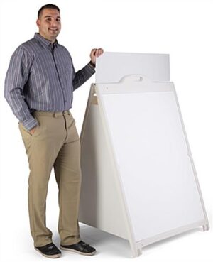 For an eye-catching display frame this 36 x 48 sidewalk sign with inserts is the perfect fit! These sandwich boards feature 360° advertising, using changeable poster panels, triangle sides, and a header to captivate passing pedestrians. Arriving with white Coroplast®, the double sided sidewalk sign provides the basics so you can print and customize for upcoming sales, new products, or promoting your business in general. When you’re setting up the changeable posters easily slide through the top of the frame and stay in place with secure stay tabs. Despite their impressive display size, these sandwich boards are lightweight and include wheels and a handle for easy transport inside and out. If you’re expecting a windy day, the base can be weighted with up to 6lbs of sand. Try this sidewalk sign to draw in potential customers and stand out from your competitors!