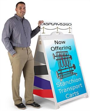 Stand out in a crowd with this 36 x 48 custom printed sidewalk sign, available with full color UV graphics! This double sided display includes 2 Coroplast® posters, 2 triangle side panels, and a header for a 360° visual promotion. While many businesses use simple letter boards or a write-on frame, this free standing sidewalk sign will pop out with brilliant colors only available with UV application technology. When not in use, this mobile display can both be wheeled away and carried with the built-in handle. If you’re worried about stability on windier days, the frame can be weighted with up to 6lbs of sand for extra support. The full color inserts are easy to place and remove as needed, with built-in edge tabs that ensure that your large poster boards will stay put. Advertise your business with impressive graphics that can be seen from every angle, thanks to this sidewalk sign!