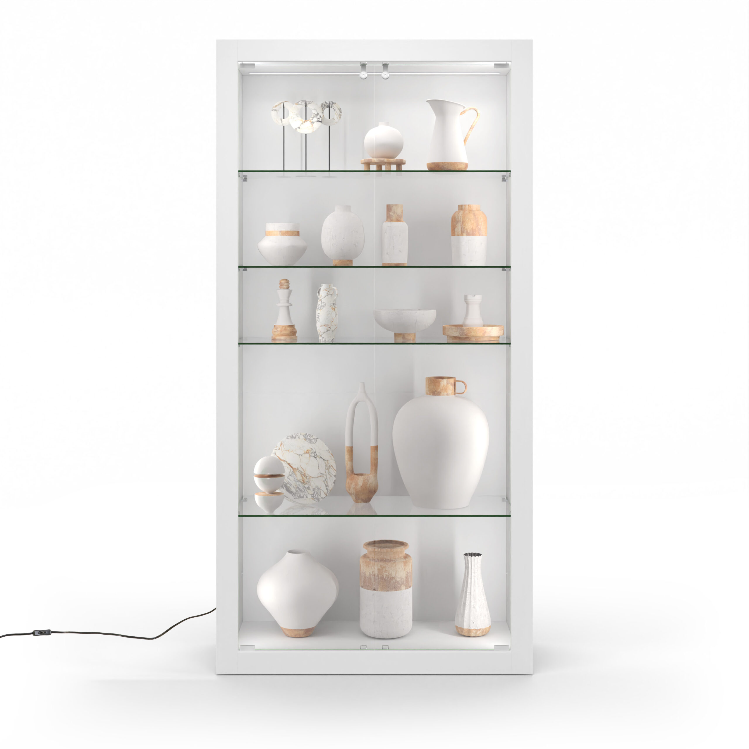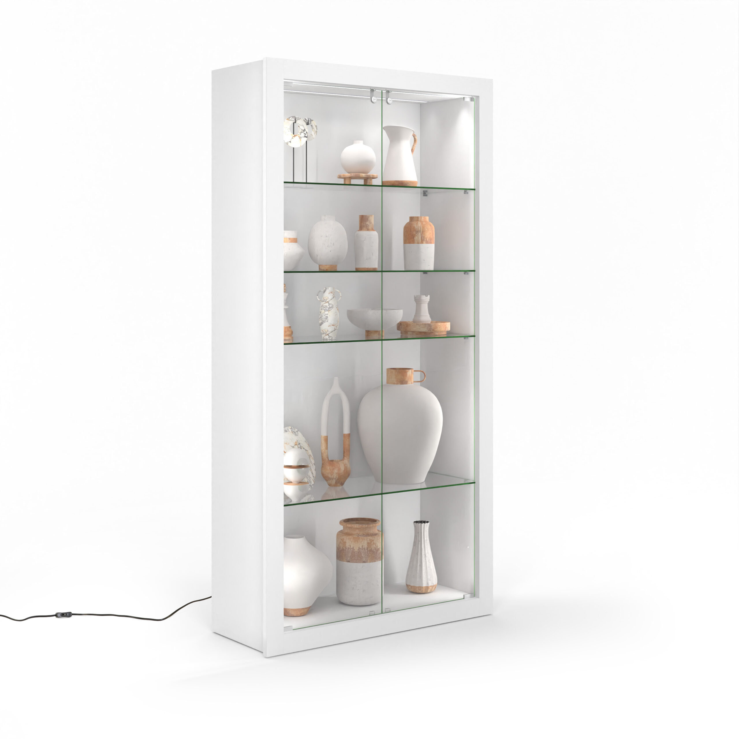 This sleek 39″ white retail glass display cabinet is beautifully designed to showcase your products with elegance and security. The modular display case features lockable glass doors and energy-efficient LED lighting, ensuring your merchandise or collectibles are prominently displayed and protected at the same time. With tempered glass and four adjustable shelves (each capable of holding 44 lbs. with generous 13″ shelf clearance), our modern floor-standing case offers versatility and strength for your merchandise. The unit arrives fully assembled and has a 13′ power cord, simplifying setup and placement. The modular design of this unit seamlessly integrates with other pieces in the collection, ensuring a cohesive showcase presentation offering versatile and customizable display options. This retail glass display cabinet is suitable for any boutique or showroom looking for an upscale way to showcase products, artwork, or exhibits stylishly and professionally.
