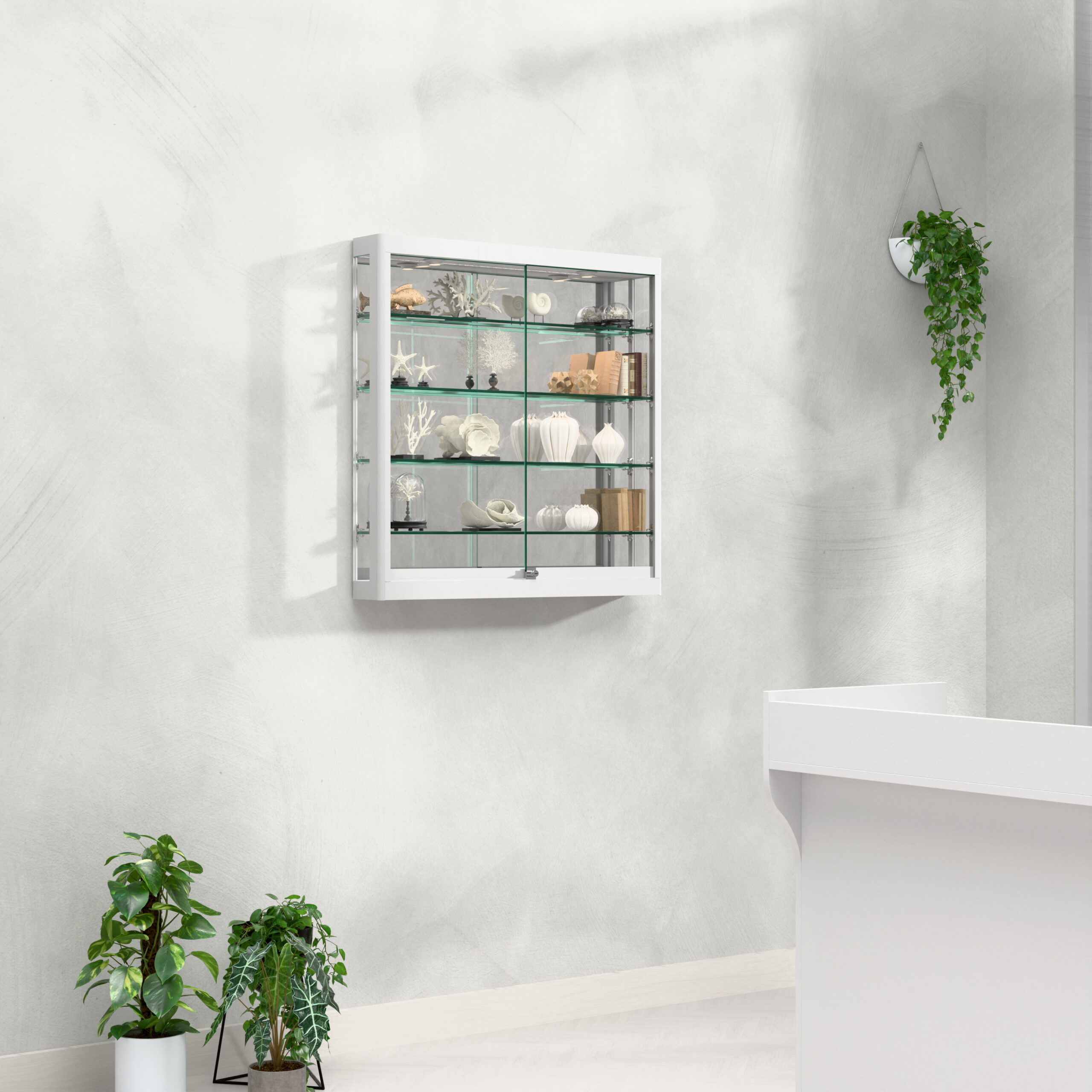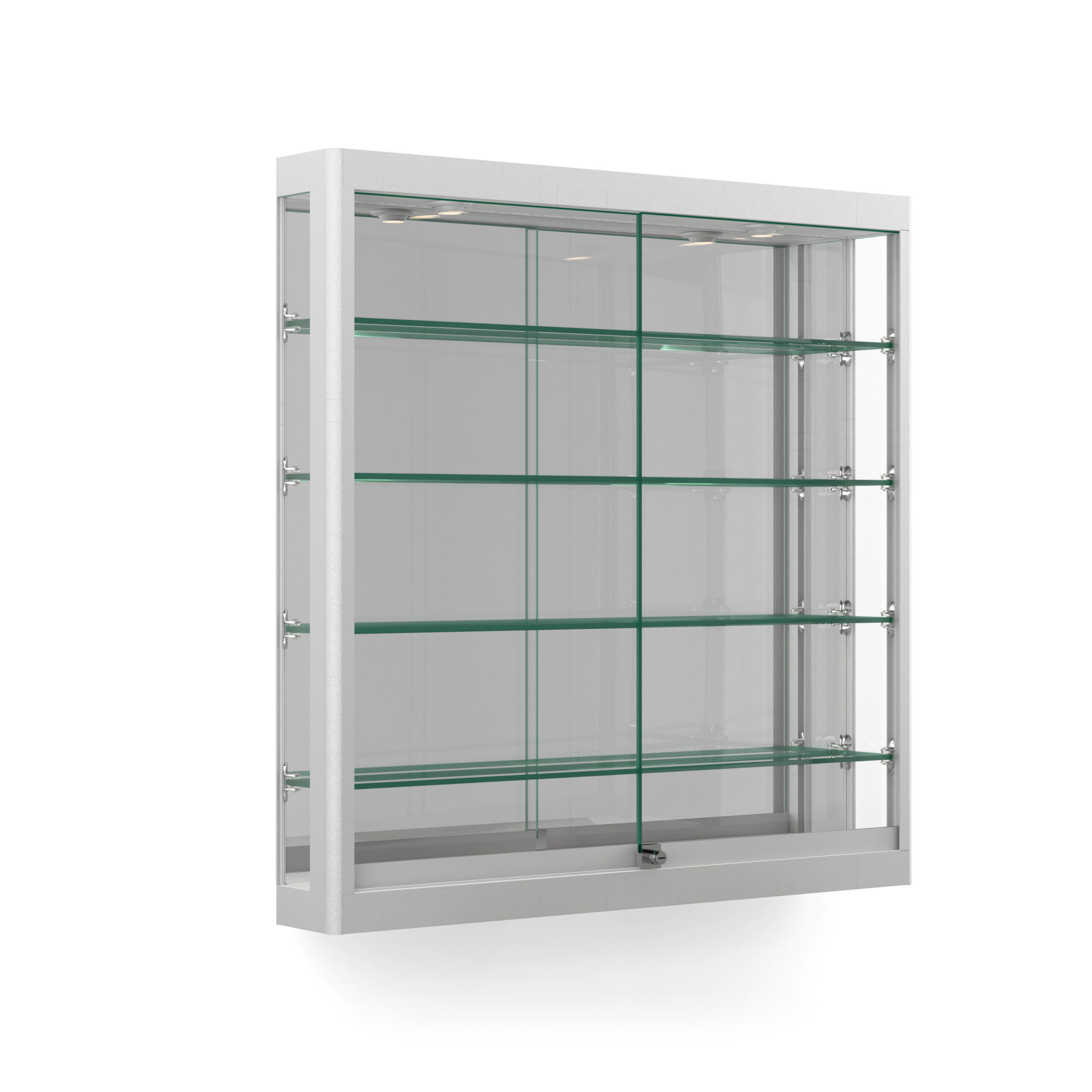 Bring your products into the limelight with a wall LED display cabinet that features 2 adjustable overhead lights. Crafted from aluminum and tempered glass, each high quality fixture was contemporarily designed for long lasting use. The fully assembled display cabinet comes ready to use right from the box, simply mount the z-bars in your shop with the included hardware and you’re ready to go. While the 2 bulbs only consume 2.5 watts of power they provide powerful lighting for showcasing your merchandise. Additionally, the 4 tempered glass shelves are adjustable allowing for larger items to fit in the aluminum case. Lock away expensive collectables with the included high quality plunger and key set that prevents unwanted handling. Use this display cabinet as an effective lighting and storage solution in your store or business today!