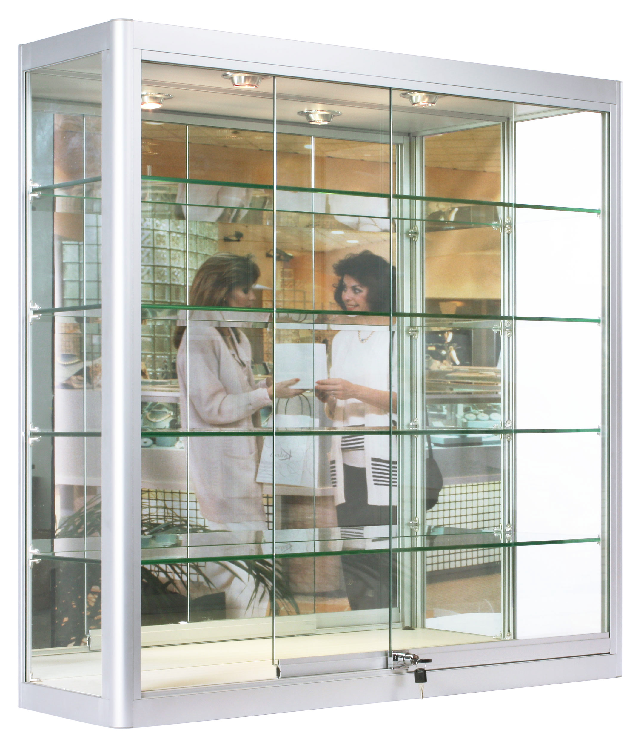 Keep your merchandise safely visible with this LED wall display case that comes with a plunger lock and key set. Sliding doors give way to 4 tempered glass shelves, each illuminated from the top lights above. The aluminum display case features a durable yet stylish design that is sure to get noticed in any busy environment. Each mounted cabinet has a power switch conveniently placed inside the glass doors to turn off the lights without having to reach for the plug. The 10” deep shelves are adjustable allowing for a wide variety of merchandise to be stored. Use this mounted cabinet as an display case to showcase jewelry, electronics, collectables, or other high end merchandise.