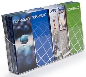 Brochure Holder – This brochure holder is great as an acrylic brochure display, countertop holder, or as a bank display. Custom display ideas are welcome. Display unit can be used sit on your counter, utilizing it’s rubber feet to prevent skidding. It is also wall mountable, using mounting holes and hardware provided. Pockets are designed to accommodate standard 4″ x 9″ brochures or greeting cards. Unit stands 1/2″ off of the wall at base, and is flush with the wall at the top of display.