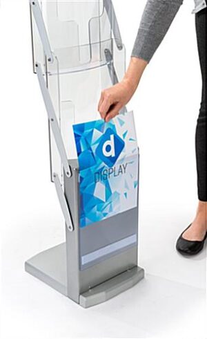 This zig zag magazine stand is the ideal way to showcase literature at the next trade show. A collapsible design with included carrying case makes this multi-pocket portable display perfect for hassle-free transportation from one event to the next. The folding magazine stand features a sign holder on the front ideal for branding the literature display or for sharing messages with trade show attendees. The collapsible feature allows the display to break down while still holding your content. A portable carrying case is included for transporting from one location to another. The multi-pocket magazine stand is a great way to share your printed materials with guests!