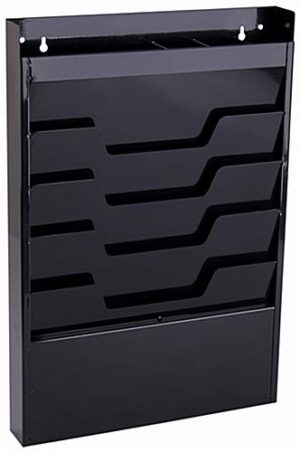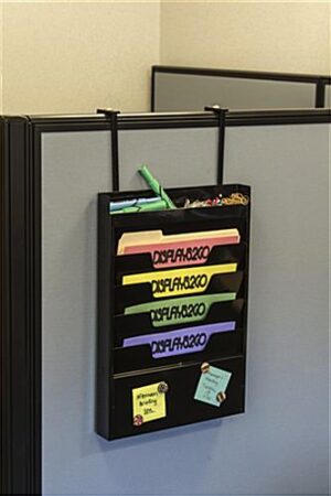 This wall file hanger is more versatile than your average mounted office organizer. The black powder coated metal folder system comes with mounting hardware to fix the unit to many structures, and can also be laid flat for desktop placement. With the help of an add-on accessory, the file hanger with 4 folders can also be hung over office fixtures like cubicles, doors, or partitions. Each pocket fits letter size folders in landscape orientation and has radius cut-outs for easy access and viewing of literature. A rectangular organizer section at the top allows for more than just paper products to be stored in this folder system. Whether mounted, hung, or resting on a desktop, the durable black file hanger makes organizing your office easy and stylish.