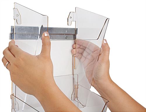 This catalog holder, magazine wall rack also features a notch pocket in the front for easy access to the periodicals. Besides using this hanging storage system to show monthly publications, offices can also use it to organize files, folders and documents. A magazine wall rack, such as a literature display and wall-mount holder is great for use in offices, salons, waiting rooms and receptions areas. The innovative system of overlapping shelves allow users to keep more literature in less space. Therefore, this lightweight magazine wall rack that hangs is sure to save space! With this literature storage system, users have the option to show the publications in two viewing options. Users have the options to display the publications at a full-view or half-view by simply attaching the insert on the side of the pocket into the slot. The purchase of this unit will include all the necessary mounting hardware. This hanging storage system is available in other configurations as well to accommodate all of your magazine storage needs. Add organization and maximize your space with this hanging literature display.
